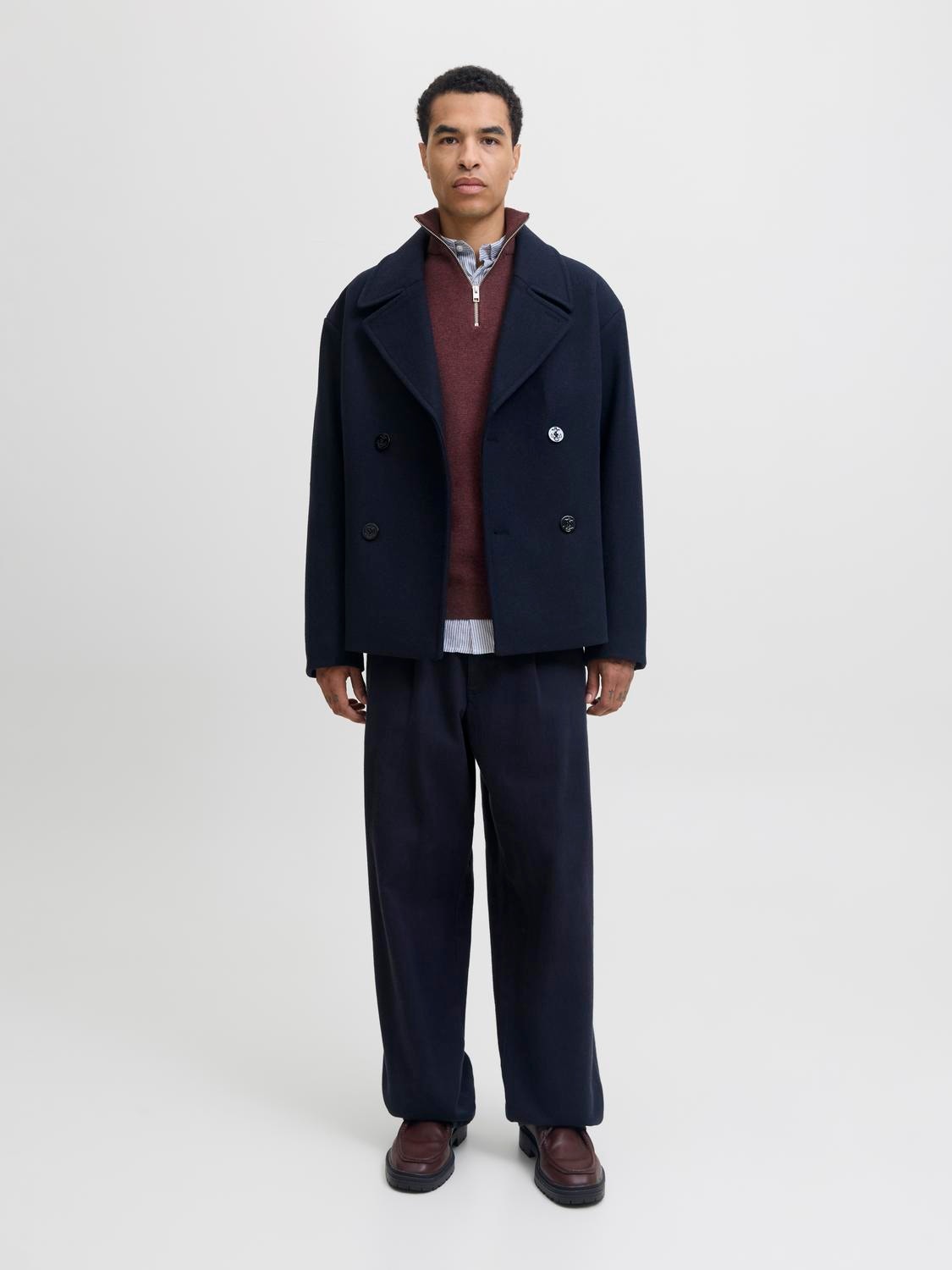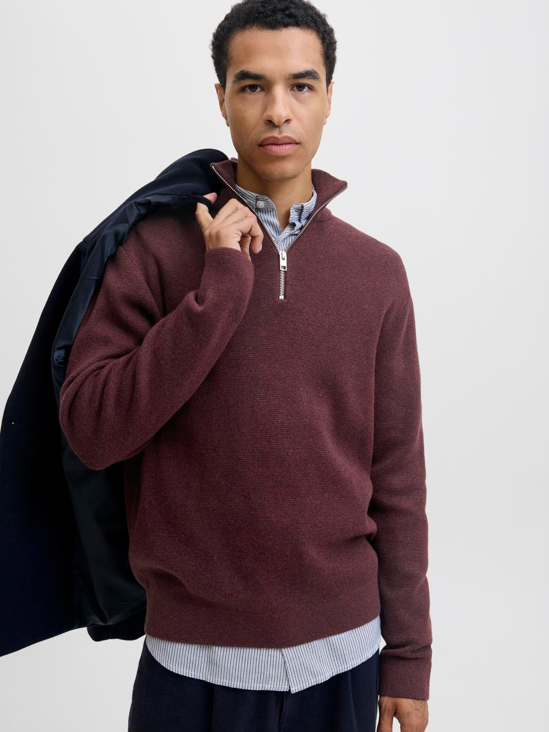 Flat knit is a knitted fabric with comfort and flexibility. - Product Type : Sweater - Neck : High neck - Sleeve : Long sleeves - Closure : Quarter zip fastening - Fit : Relaxed Fit